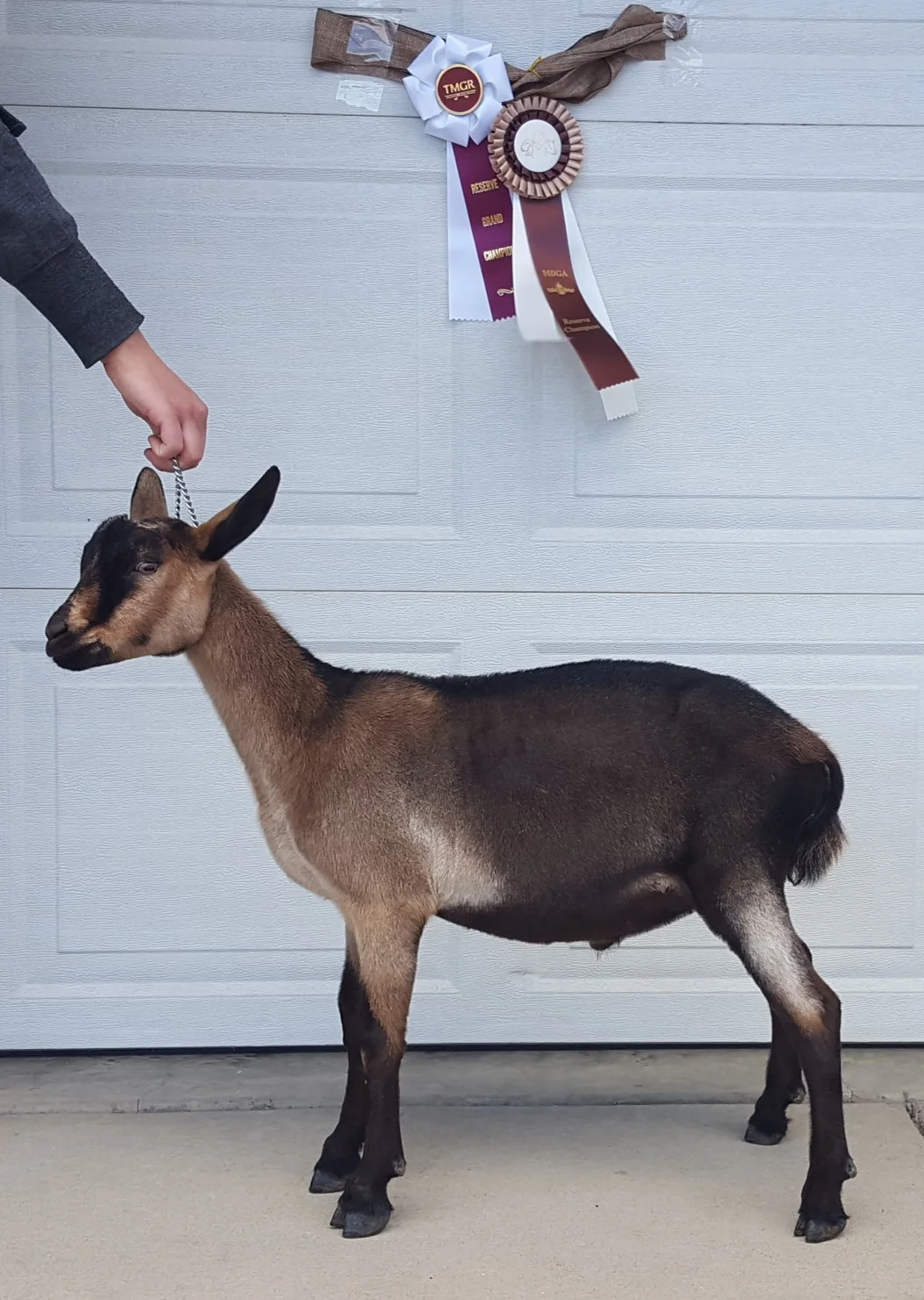 Annie was a very friendly doe with good dairy character from milking lines. She had good udder attachment and a very soft udder that was easy to hand milk. As a 3rd freshener in 2018 she was producing over 3/4 of a gallon as a once a day milker. Annie's daughter, Creekside FS Eowyn (F1), has earned 2 Legs towards her MDGA Finished Championship and 2 Legs towards her TMGR Finished Championship. Annie's daughter, Creekside FS Elsie (F1), has earned 1 Leg towards her MDGA V-Show Finished Championship.